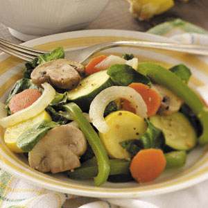 In a large skillet, saute the zucchini, yellow squash, onion, mushrooms, green pepper and carrots in butter until crisp-tender.