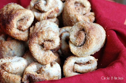 Cut the crusts from a slice of bread and roll until very thin. Spread both sides of the bread with melted butter and then sprinkle one side with the cinnamon sugar, making sure to cover very well. Fold each side into the middle and then gently roll up and place in a buttered mini muffin tin. Spread a little more melted butter on each roll and sprinkle with a little more cinnamon sugar. Alternately, you can fold the bread into a triangle, and then fold into another smaller triangle and place on a parchment-covered baking sheet.
