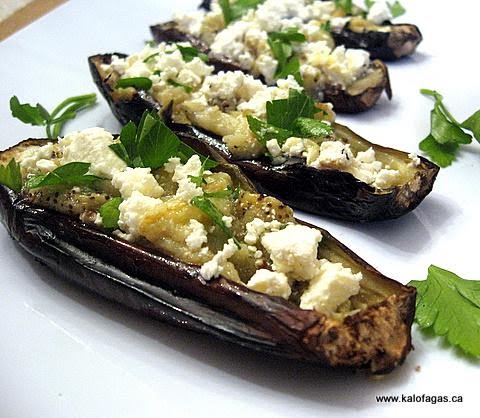 If you enjoy Melitzanosalata but you’re looking for a different take and presentation of this Greek taverna offering, this will do the trick. Simply put, eggplants are charred over direct heat on your gas or charcoal grill, the meat of the eggplant inside is spooned out, mashed and dressed with garlic, olive oil and seasoned then, spiked with some crumbled Feta and parsley. One simply spoons back the filling into the eggplant shells and serve up to your guests as part of your array of Greek appetizers.