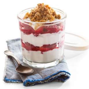 To assemble parfait, layer yogurt and the strawberries with their juice in a 2-cup container. Top with granola.