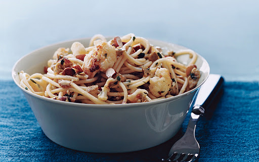 SPAGHETTI WITH CAULIFLOWER, GREEN OLIVES AND ALMONDS