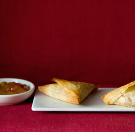 Cover stack of phyllo sheets with plastic wrap and a damp kitchen towel. Keeping remaining phyllo covered and working quickly, place 1 sheet on work surface. Gently brush with some butter, then lay a second sheet on top and brush with butter. Cut crosswise into 4 strips. Put 2 tablespoons filling near one corner of 1 strip and fold corner of phyllo over to enclose filling and form a triangle. Continue folding strip, maintaining triangle shape. Put samosa, seam side down, on baking sheet. Make 3 more triangles in same manner. Repeat with remaining phyllo and filling. Generously brush both sides of each samosa with butter and bake, turning samosas over halfway through and switching position of sheets, until golden and crisp all over, about 25 minutes total. Cool slightly. Serve warm or at room temperature.