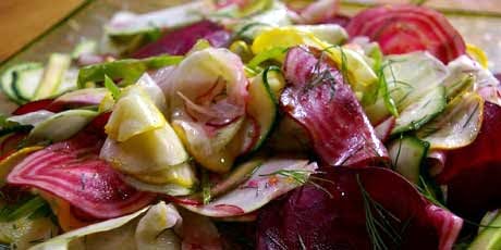 1. Choose a selection of colourful vegetables from among, for example: zucchini, carrot, red and yellow beets, fennel, kohlrabi, celery, asparagus, radishes, snow peas. Peel the vegetables that need peeling. Slice the bulb-like vegetables very, very thinly on a mandoline. Use a vegetable peeler for tricky vegetables such as asparagus, and sliver anything like the snow peas with a knife.