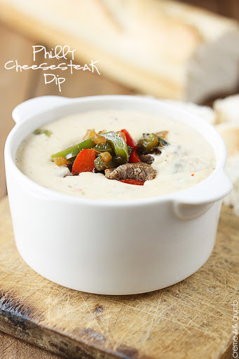 When the cheese is all melted and smooth, stir in the steak, peppers and onions, and remaining seasonings. Serve with bread for dipping. Enjoy!