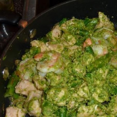 In a large pan, heat oil or butter and saute shallot for about 1 minute. Add garlic and chicken and cook on medium high heat until chicken is browned. Add asparagus and cook for about 1 minute. Then add shrimp and cook just until the shrimp starts to turn pink. Add about 1/3 cup of Walnut Asparagus Pesto and stir to coat.