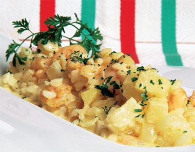 Picamos las cebolletas y las sofreímos; pelamos las manzanas y las cortamos en dados de un centímetro. Las añadimos al sofrito, lo rehogamos e incorporamos el curry. Mojamos con el caldo y, cuando empiece a hervir, agregamos el arroz y las gambas. Lo dejamos hervir cuatro minutos y añadimos la nata.