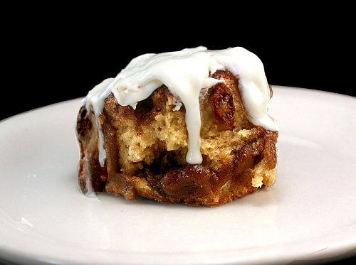 7. Drizzle or glob (I did both) cream cheese glaze frosting over the warm biscuits. Sprinkle glaze with a bit of cinnamon sugar, if desired. Enjoy them while they last!