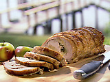 In a large skillet, heat the olive oil over medium-high heat. Add the onion, apples and sage. Saute until softened. Remove from the heat and gently stir in the bread, egg, butter and salt and pepper. Add the chicken broth gradually until everything is moistened. Let the stuffing mixture cool completely before putting it in the pork loin. Spoon the stuffing down the pork, horizontally, in a line. Roll the pork over the stuffing, jelly roll style, ending with the seam down and fat side up. Lightly score the fat, in a diamond pattern, with a sharp knife. Tightly tie the pork roast up with butcher's twine, season it with more salt and pepper, and transfer to a roasting pan. Roast the pork in a preheated oven for about 90 minutes or until an instant-read thermometer registers 160 degrees F. Remove from the oven and let rest for 15 minutes before slicing. Garnish with apples and fresh herbs.