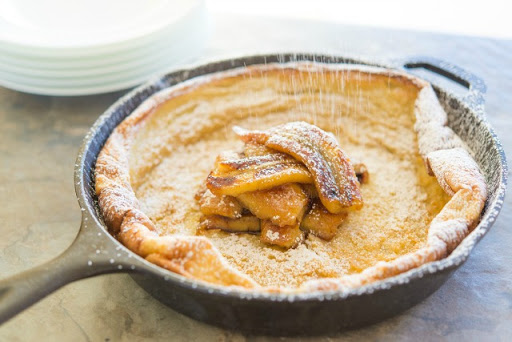 Preheat the oven to 425F. In a 10-inch cast iron skillet set over medium heat, melt the Land O Lakes® Butter. In the meantime, whisk together the eggs, milk, sugar, vanilla and nutmeg until well combined and slightly frothy on top. Whisk in the flour until no flour streaks remain, but a few lumps are okay. Pour the batter into the skillet (all of the butter should be melted at this point), and pop the pan into the lower third of the oven. Bake for 18-20 minutes until the Dutch baby is cooked through.