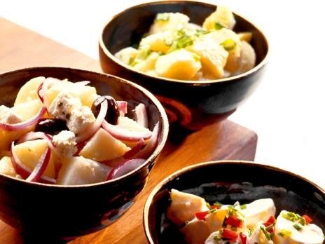 4. Grekisk variant: Tärna fetaosten och strimla rödlöken. Vispa samman olivolja, citronsaft, salt och peppar. Vänd ner blandningen, fetaost, rödlök och oliver i potatistärningarna.