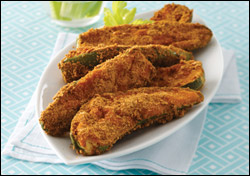 Pour egg substitute into a shallow bowl. Add remaining 1 tbsp. hot sauce and mix well. One at a time, gently cover pepper halves with egg mixture, shake to remove excess, and then coat entirely with crumb mixture. Repeat with remaining pepper halves, evenly placing them on the baking sheet.