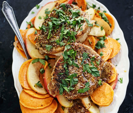 Sautéed Pork Chops with Sweet Potato, Apples and Mustard Sauce