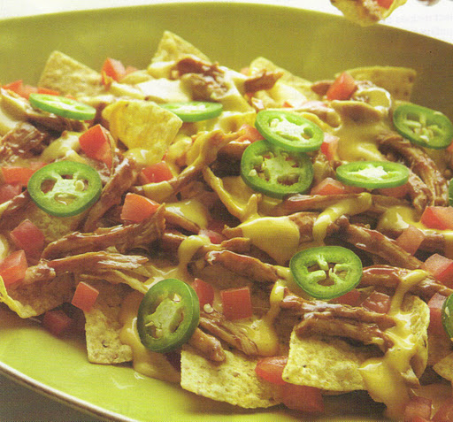 Spoon chicken mixture over chips; top with Velveeta sauce, tomatoes and peppers.