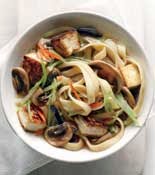 3.Meanwhile, in a large nonstick skillet, heat the vegetable oil over medium-high heat. Add the tofu in a single layer and cook, undisturbed, until browned on 1 side, about 3 minutes. Repeat, turning the cubes, until browned on all sides; transfer to a plate. Add the mushrooms to the skillet and cook, stirring occasionally, until browned, about 5 minutes.
