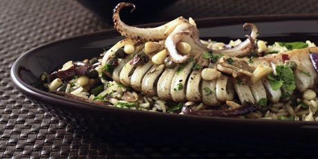 5. To serve, divide rice among plates and arrange squid over. Spoon brown butter and capers sauce over. Garnish with pine nuts.