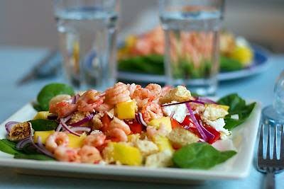 Blanda marinaden och skala räkorna, låt räkorna ligga i marinaden någon-några timmar. När det är middagsdags, koka couscous i grönsaksbuljong, enligt anvisning på paketet. Tärna paprika, mango och tomater. Skär rödlöken i tunt. Blanda couscous med resten utav salladsingredienserna. Dela bröd i små fyrkanter och rosta till krutonger i en torr panna. Lägg upp couscoussalladen på tallrik, pynta med smulad fetaost och krutonger. Lägg därefter ner chiliräkorna i en het stekpanna (de ska i princip bara ner och vända). Toppa couscoussalladen med räkorna och använd marinaden som (stark!) dressing.