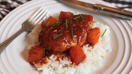 Add butter to hot skillet and lightly brown pineapple chunks add sauce and water, add pineapple. When sauce thickens return meat to pan coating each piece with sauce. Cook until pork is done.