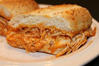 Put frozen chicken, wing sauce, and ranch dip mix into crock pot.