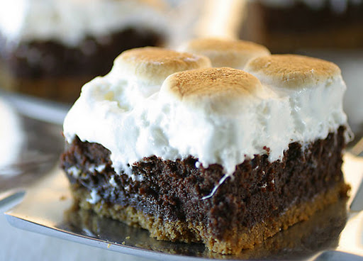 Remove from the oven and carefully position a rack about 6 inches from the broiler and preheat on low. Layer marshmallows across the top and toast under the broiler until golden, (keep an eye on it, it can go quick), about 2 minutes. Cool on a rack, gently removing the brownies from the pan using the aluminum flaps. Carefully separate any marshmallow from the foil and fold away. Cut into 12 (2-inch) squares.