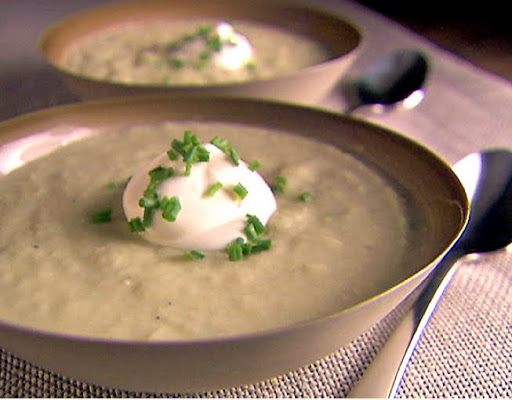 Ladle the soup into serving bowls. Dollop the top of each of the soups with a spoonful of the softened mascarpone cheese and top the cheese with chives.