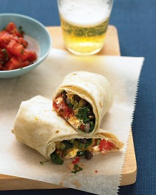 Spoon bean mixture on top of salsa. Fold side of tortilla closest to you over filling, then fold right and left sides in toward center; tightly roll up burrito. Cut burritos in half, and serve with more salsa.
