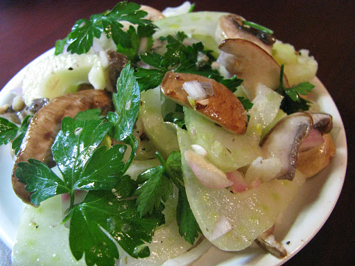 Cut the fingers off the fennel bulb, and discard, and then peel the bulb. Slice the bulb very thinly into rings. Toss with the mushroom slices, and parsley leaves. Dress the mixture with olive oil, and season with salt, pepper, and lemon juice, to taste. Serve with Parmesan curls on top.