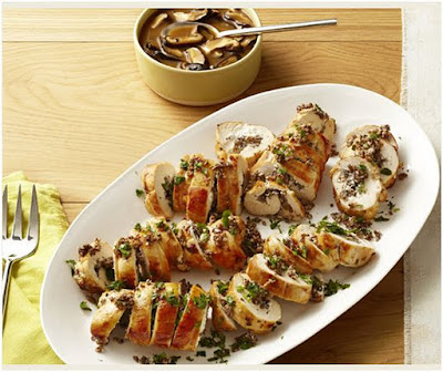 4. Coat each chicken breast with 2 tablespoons goat cheese and top with 1/4 cup duxelles.