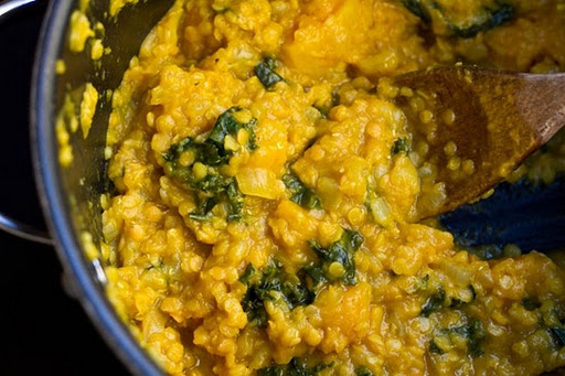 2. Stir in curry powder and cook another couple minutes. Add broth and lentils and bring to a boil. Reduce heat and cook for 10 minutes.