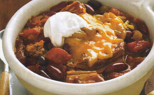 Combine all ingredients except meat, cheese and sour cream in slow cooker. Add meat; cover with lid. Cook on LOW 10 to 12 hours (or on HIGH 7 hours).