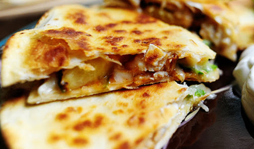 To assemble, sprinkle four browned tortillas with grated Monterey Jack. Arrange chicken slices evenly over the surface. Add pineapple slices and jalapeno slices. Sprinkle on cilantro. If desired, drizzle extra barbecue sauce over the top. Add second browned tortilla on top of each one. (You'll have four complete quesadillas at this point.)