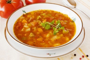 Puree the tomatoes, chick peas and garlic with the broth and chili powder in a blender (in batches, if necessary) transfer mix to a medium large pot, bring to a boil, lower the heat and simmer for about 10 minutes. (If using and an immersion blender, you can process the ingredients directly in the cooking pot).