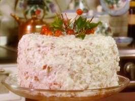 Blend cream cheese and butter together in a mixing bowl. Add marshmallows and sugar and blend. Fold in coconut and nuts. Spread between layers and on top and sides of cooled cake.