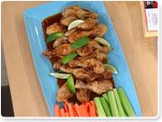 Sprinkle the coated wing with scallions and sesame seed for garnish. Serve with lime wedges.