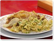 Top chops with sautéed fennel, apples and onions, spoon cider sauce over top, serve egg noodles alongside.
