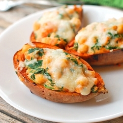 Coat potato skins with a drizzle of oil and bake for about 5 minutes to get a crispier outside. Remove from oven and fill each skin with the sweet potato mixture and top with shredded mozzarella cheese. Bake again for 10-15 minutes, or until cheese is melted and filling is heated through.