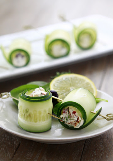 Place 1 - 2 teaspoons of mixture at one end of a cucumber strip and roll up. Secure with a toothpick. Repeat with remaining strips. If not serving immediately, chill until ready to serve.