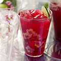 Hibiscus tea adapted from Giada's recipe. Dried, sweet hibiscus flowers can be found at Trader Joe's. Unsweetened hibiscus flowers or dried rose petals can be found in Latin markets.