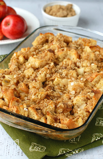 Preheat oven to 350. Combine remaining 4 T butter and ¼ apple pie spice Cook 3 minutes until melted. Uncover toast and drizzle with butter mixture. Bake uncovered 35-40 min. Sprinkle with powdered sugar and serve with maple syrup.