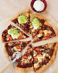 Slide the pizza onto the preheated stone and bake for 12 minutes, until the bottom is crisp and the cheese is bubbling. Transfer the pizza to a work surface and top with the lettuce and dollops of the sour cream. Cut into 4 or 6 wedges and serve at once.