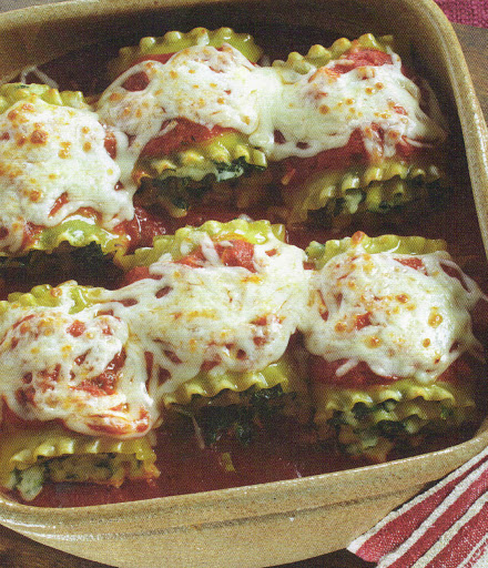 Spread mixture onto cooked lasagna noodles; roll up tightly.