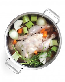 Pour out fat. Add whole chicken, carrots, celery, onion, peppercorns, parsley, and enough cold water to cover ingredients by 1/2 inch (about 12 cups).