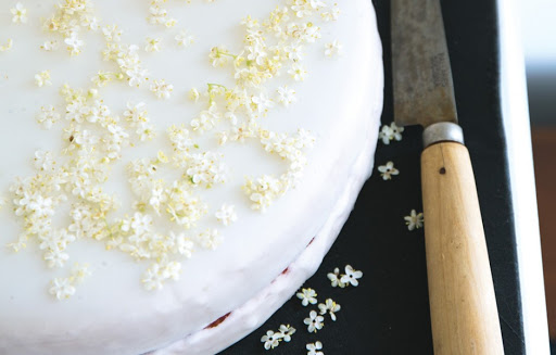 Place cake on a wire rack set inside a rimmed baking sheet and pour icing over cake. Spread with an offset spatula to smooth top and cover sides. Let stand at room temperature until set, at least 30 minutes. Decorate with elderflowers, if using, just before serving.