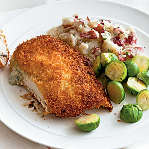 3. Place flour in a shallow dish. Combine milk and egg in a shallow dish, stirring well with a whisk. Place panko in a shallow dish. Working with 1 chicken breast half at a time, dredge chicken in flour, then dip in egg mixture; dredge in panko. Repeat procedure with remaining chicken, flour, egg mixture, and panko.