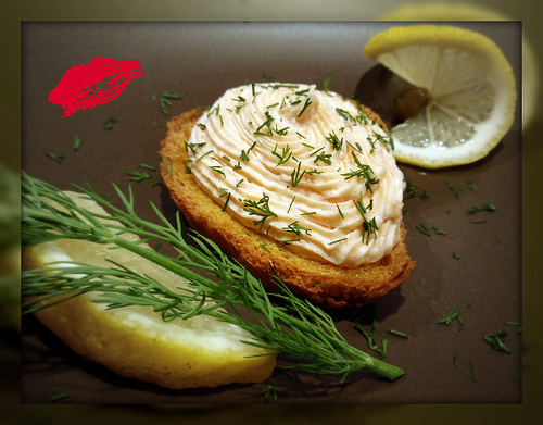 Load a piping bag with a star tip with the cold salmon mousse. Pipe the mousse onto the croute, drizzle a little white truffle oil over the top and sprinkle some chopped fresh dill over the top. Serve with lemon wedges for a little tartness if desired. Pucker up!