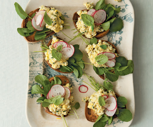 * Toast or grill the bread. Lay 1 slice of salmon on each piece of bread, spread on the egg salad, then garnish with a sprig of dill.