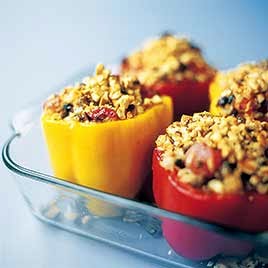 5. Place peppers cut-side up in 9-inch square baking dish. Using soup spoon, divide filling evenly among peppers. Spoon 2 tablespoons ketchup mixture over each filled pepper and sprinkle each with 1 tablespoon of remaining cheese. Bake until cheese is browned and filling is heated through, 25 to 30 minutes. Serve immediately.