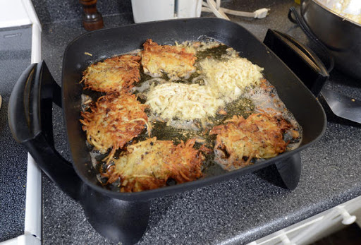 Pour a half-inch (1 cm) of oil into a large, heavy-bottomed pan. Bring to medium-high heat. Using a slotted spoon, scoop balls of the mix and squeeze to press out excess liquid. Slide flattened latke into oil, pressing down to flatten more. Cook halfway, until golden on bottom, about 6 minutes. Flip and cook through on other side, about another 6 minutes. Transfer to paper towel to absorb oil.