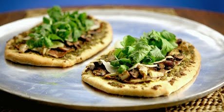 5. Place rolled crust on pan or stone and spread a thin layer of the pesto mixture all over. Arrange Prosciutto on top and spoon mushroom filling over top and bake for 10 to 15 minutes, until golden at the edges.