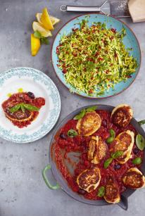 Ricotta fritters with tomato sauce & courgette salad