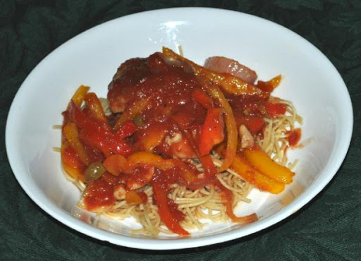 This used what I have on hand, it has been tweaked a bit from the original recipe in Martha Stewart Living, March 2004. Although this uses 10 cloves of garlic, crushed whole garlic isn't as strong as chopped or minced garlic. Supposedly the tomatoes in canned whole tomatoes are of better quality than those used for canned crushed tomatoes, but sometimes every minute counts. You may use fresh tomatoes, but you may want to add more salt to suit your taste preference. Serve over pasta or rice. (Served over whole wheat pasta.)
